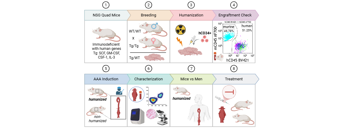 The pathological vessel dilatation of abdominal aortic aneurysms (AAAs) is a result of media destruction driven by pro-inflammatory and proteolytic activity in the vessel wall and the frequently occurring intraluminal thrombus. Available treatment to prevent the life-threatening event of aneurysm rupture is currently limited to high-risk surgery, since drug options to control aneurysm expansion are lacking. Therapeutics successful in AAA mouse models generally failed in clinical trials which has raised concerns regarding the aptness of the experimental models. Based on previous data we propose that the central interplay of leukocytes (inflammation) and platelets (thrombosis) may not be adequately represented in the experimental AAA models, since blood cell composition differs considerably between mice and men. As recommended by the FDA for preclinical drug testing, we intend to apply so-called “humanized mice” (with functional human myeloid, lymphoid and thrombocyte compartments) in models of AAA induction and treatment, to improve the reliable prediction of clinical success. In the proposed PhD project, we aim to compare resulting aneurysms in humanized versus non-humanized mice to human AAAs by a comprehensive histological, cellular and molecular characterization. Furthermore, the efficacy of thrombo-inflammatory drug candidates will be investigated in the humanized versus non-humanized models.
